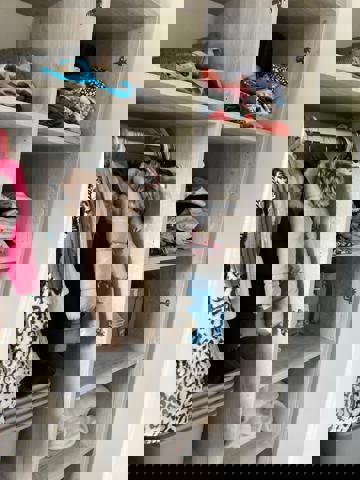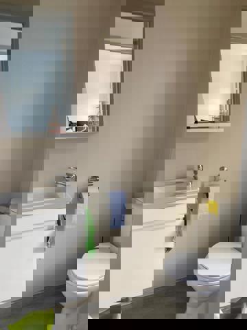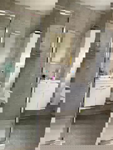 Rez : hall d’entrée, wc avec l.m., séjour (salon, sàm) semi open space avec cuisine semi équipée (four, taque, hotte, évier), buanderie avec dévidoir, salle de bains avec douche italienne, meuble lavabo, terrasse, jardin d’agrément, abri de jardin