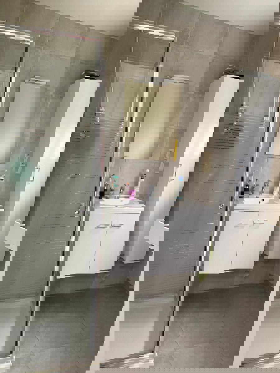 Rez : hall d’entrée, wc avec l.m., séjour (salon, sàm) semi open space avec cuisine semi équipée (four, taque, hotte, évier), buanderie avec dévidoir, salle de bains avec douche italienne, meuble lavabo, terrasse, jardin d’agrément, abri de jardin