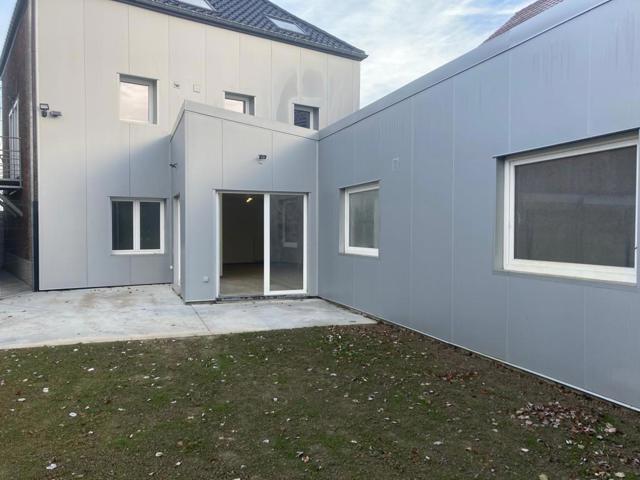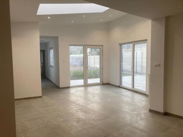 Hall d’entrée commun, hall privatif, vaste living avec 2 baies vitrées sur terrasse et jardin, cuisine équipée ouverte, wc, SDB avec douche italienne et meuble lavabo et de rangement, 3 chambres, buanderie