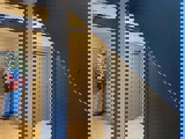 Hall commun, hall d’entrée, séjour open space avec cuisine équipée (four, taque, hotte, frigo, lave vaisselle) et terrasse, 2 chambres dont une assez petite, buanderie