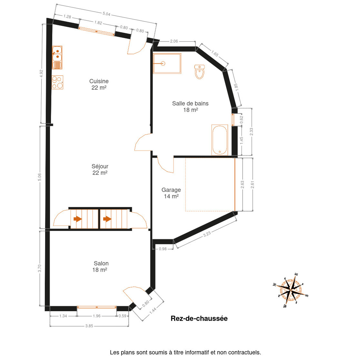 Rez-de-chaussée : un salon à faire renaître, une salle à manger pour festins futurs, une cuisine où mijoter l’imagination, une salle de bains à réenchanter, et un garage pour abriter carrosse ou outils de magicien.