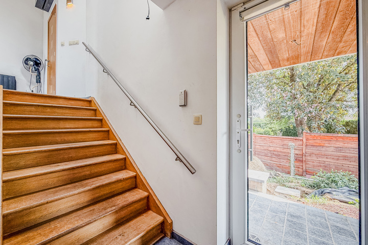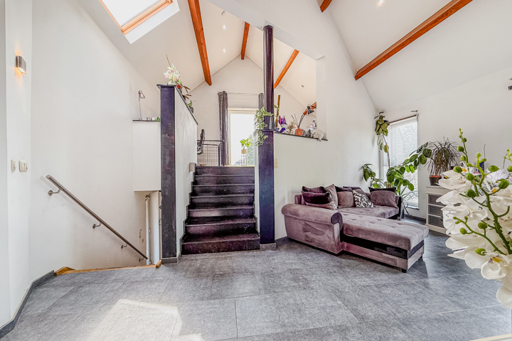 Descendez quelques marches et laissez-vous séduire par un espace de vie chaleureux :