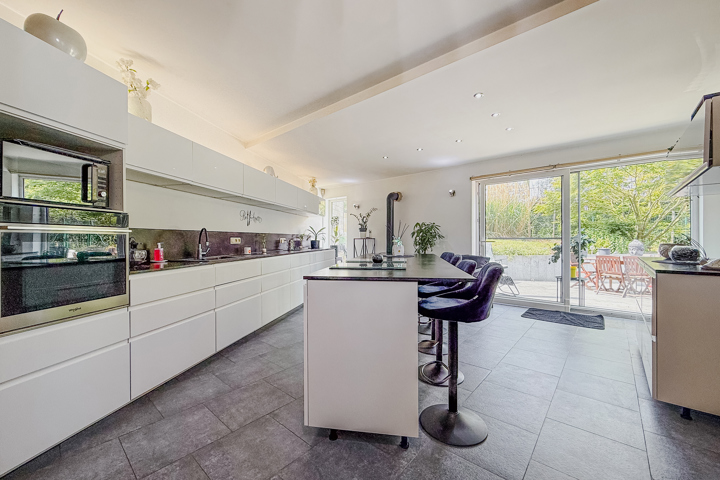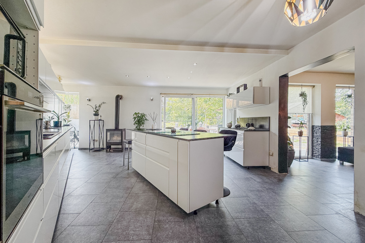 -Une cuisine ouverte, entièrement équipée, qui donne directement sur une terrasse ensoleillée et le jardin verdoyant,