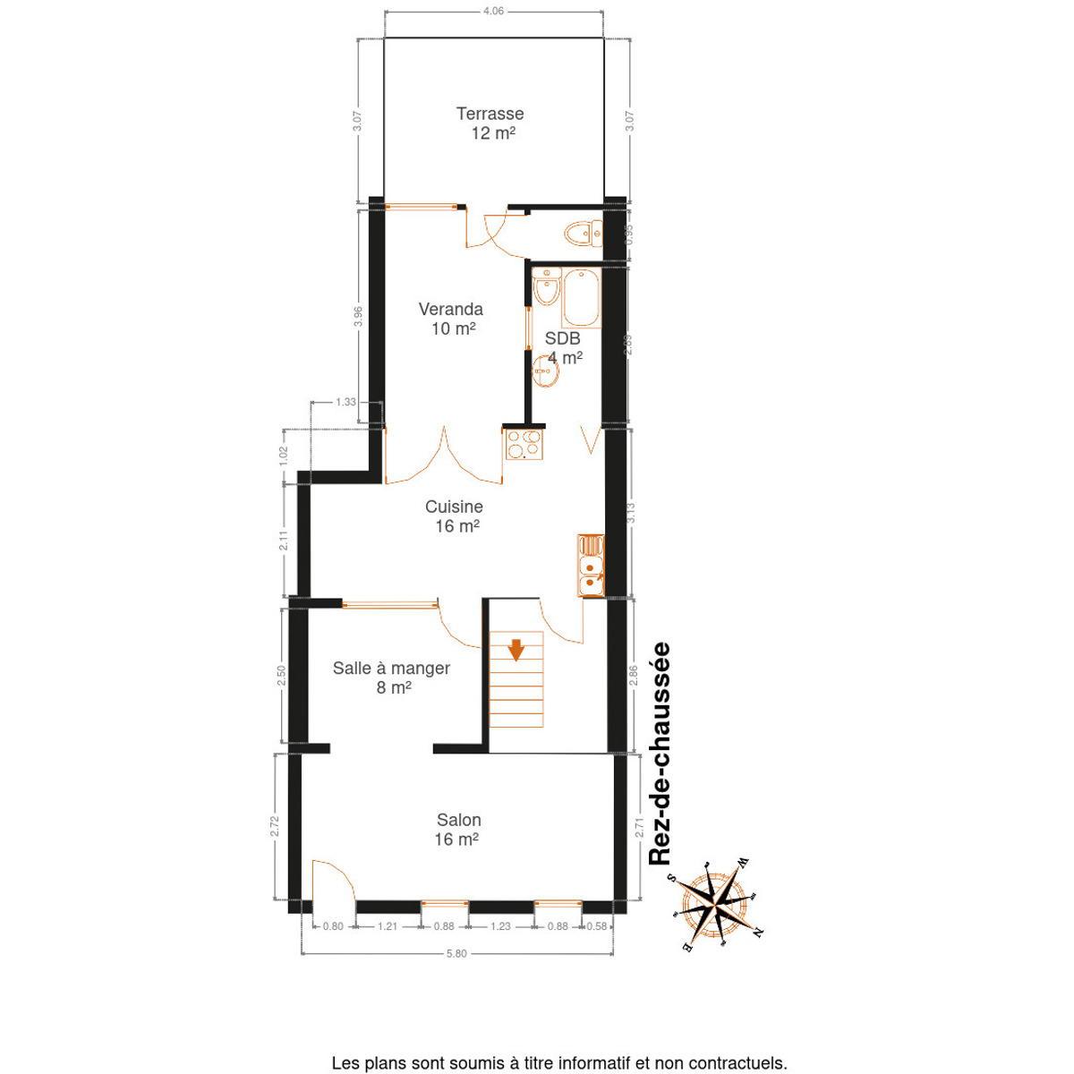-Rez-de-chaussée : salon, salle à manger, cuisine, salle de bains et véranda donnant sur l’extérieur.