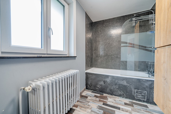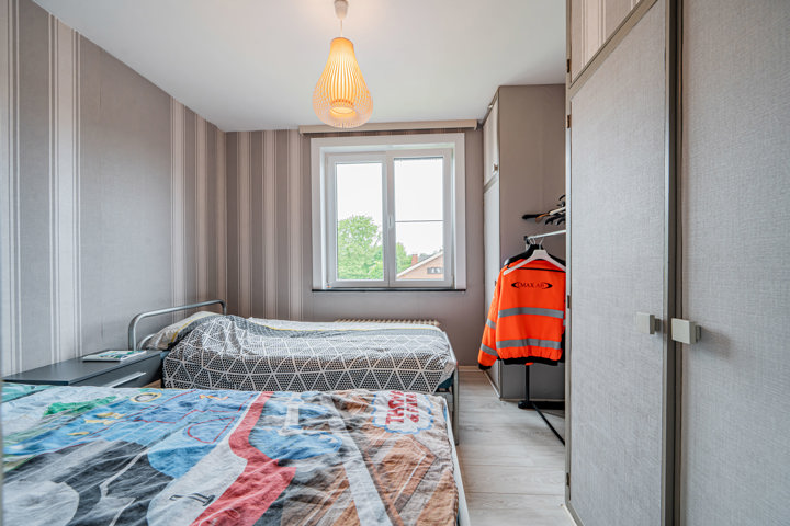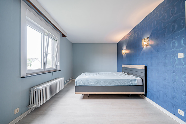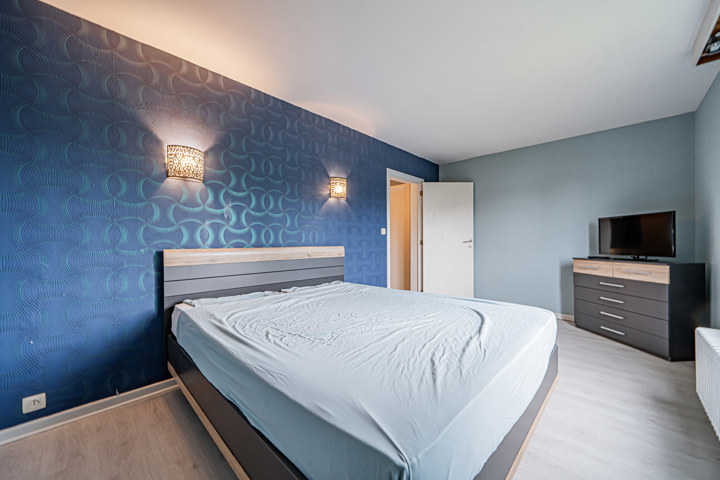 À demi-niveau, vous trouverez une première chambre confortable ainsi qu'une salle de bains fonctionnelle.